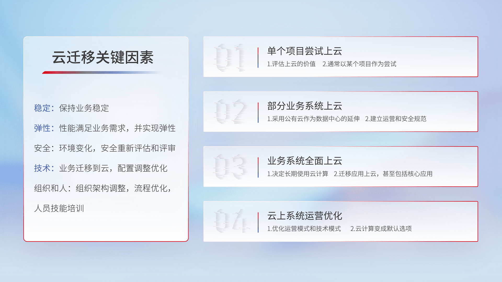 结合实际业务,,,从规划设计、、、、云平台选型、、、云原生改造、、、数据迁移、、、集成交付,,迁移全过程为客户识别最佳上云路径,,,做好风险识别管理,,,,设计网络架构、、、身份权限、、、安全审计合规、、操作审计、、、日志审计、、监控告警策略、、、多站点容灾设计等,,,对云上基础设施进行整体规划,,,,提升IT治理水平,,,,以满足弹性、、高可用、、高性能的需求。。。。