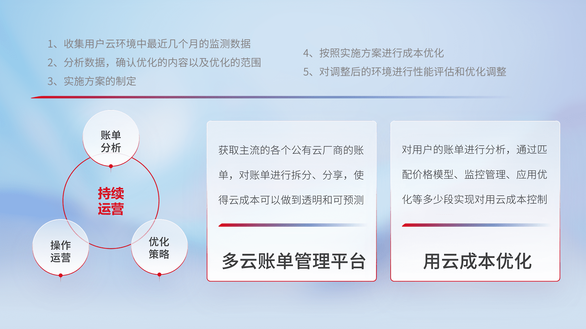通过多云纳管,,,以统一的资源数据模型把客户的云资源进行抽象和封装,,进而实现对多云资源的统一操作,,保障云资源管理的可靠性、、、、稳定性与可用性。。。。量身定制化运维内容,,配置、、、、开发运维、、、补丁管理、、、、备份、、监控、、认证和访问管理、、、审计和日常巡检等,,,保障在用云过程中的可靠度,,,稳定度以及高可用率。。。