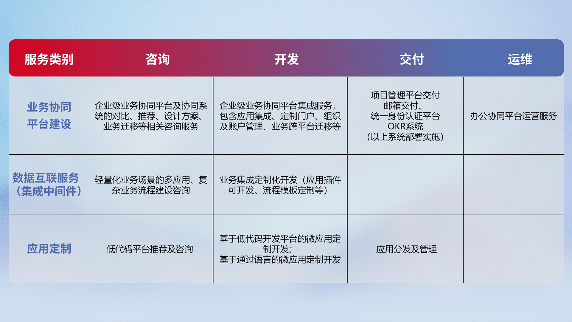 针对钉钉、、企微、、、、IDaas等平台级产品提供产品的规划、、方案、、交付、、、定制化开发等服务,,,实现如统一协同办公、、、智能客户服务、、、混合会议管理、、智能数据查询、、等业务场景,,实现数字化转型。。
